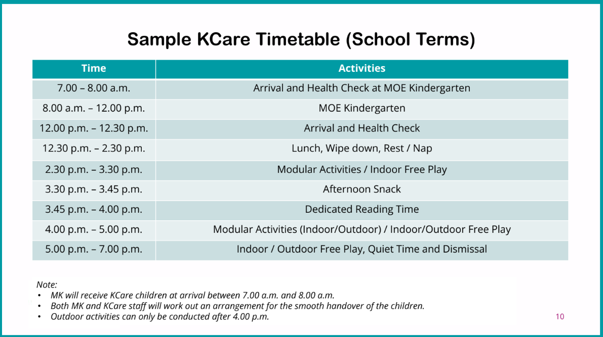 KCare is a service offered to parents whose children attend MOE Kindergarten and need care services beyond the 4-hour programme of MK.