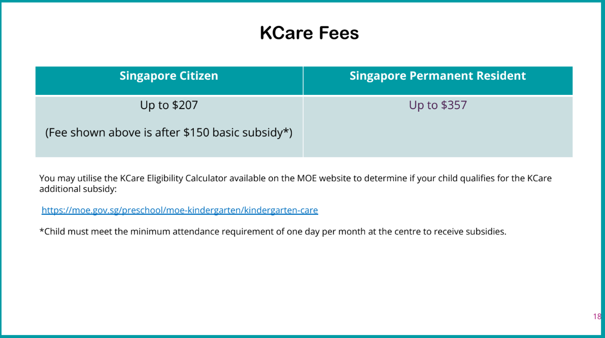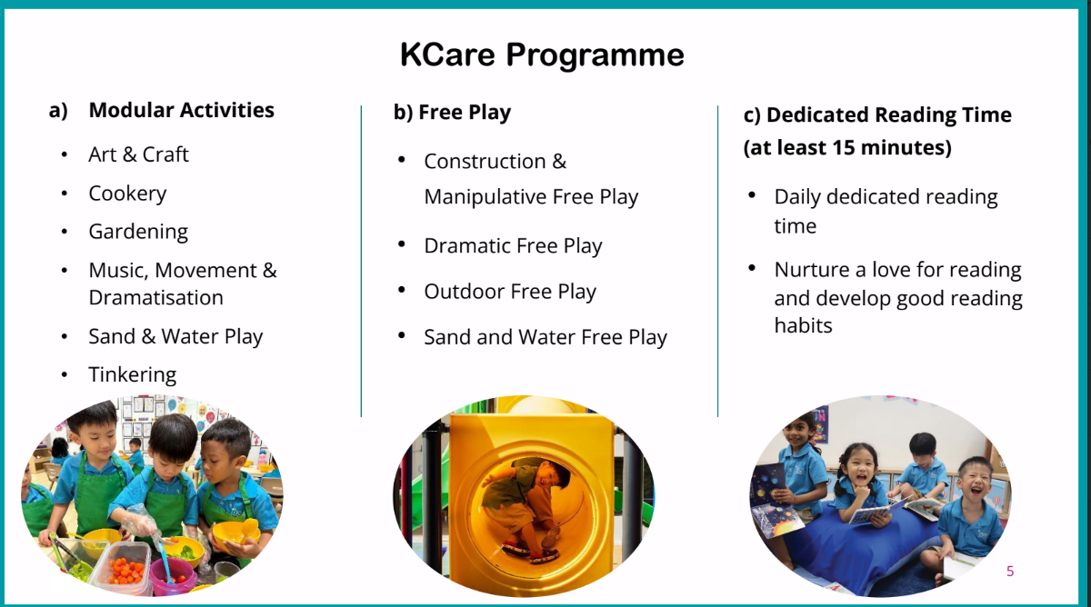 For more information on KCare, please visit https://www.moe.gov.sg/preschool/moe-kindergarten/kindergarten-care.
