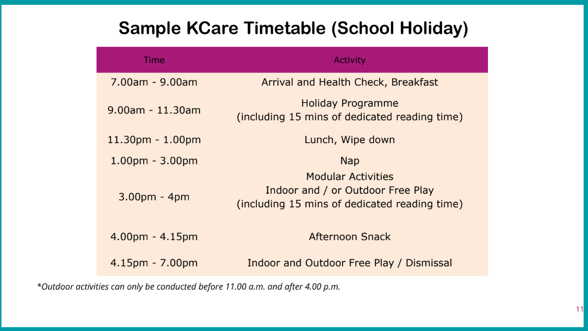 Our KCare centre operates from 12pm to 7pm on Mondays to Fridays, including school holidays. KCare operates half-days on the eve of Christmas, New Year, Chinese New Year, Teacher’s Day, and Children’s Day. The centre will be closed for up to 6 days each year, in addition to public holidays.